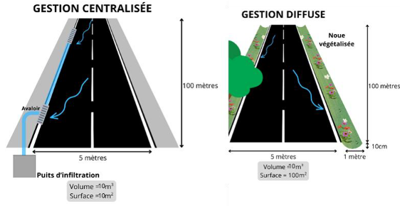 La gestion centralisée des eaux pluviales concentre les flux vers quelques points de collecte. A l’inverse, la gestion diffuse permet de maximiser l’infiltration dans le sol comme le présente le schéma suivant.